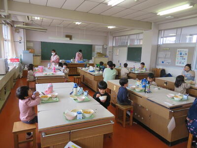 佐倉小学校の家庭科室で給食をいただきます。