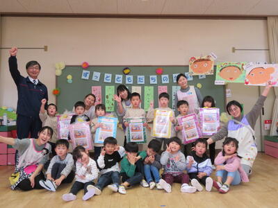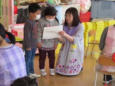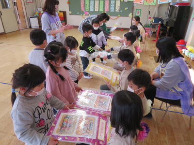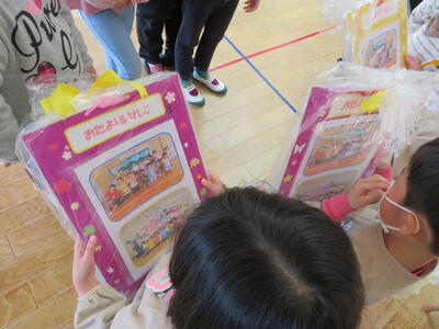 次は、たんぽぽ組さんからプレゼントが贈られました。小学校に入学したら学校から配付される、おたよりを入れるケースです。ちゅうりっぷ組のみんなはとっても嬉しそうでした。