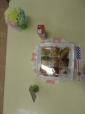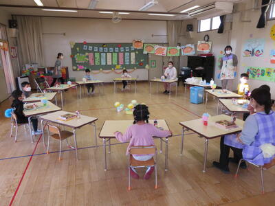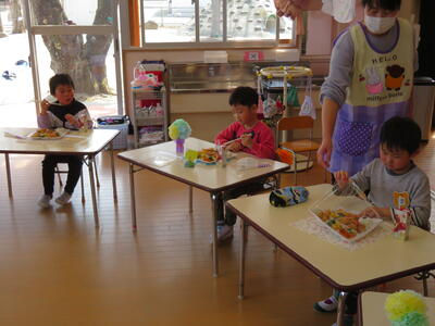 楽しみにしていた会食のスタートです。たんぽぽ組さん ちゅうりっぷ組さん 先生方は交互に座っていただきました。
