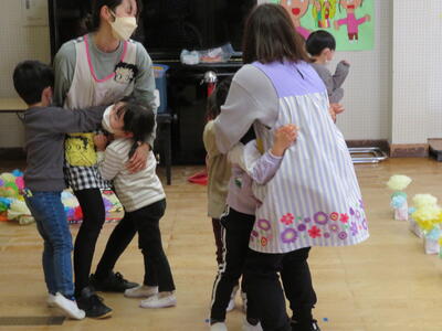 会が終わって、たんぽぽ組さんたちは先生たちと抱き合って大成功を祝いました。