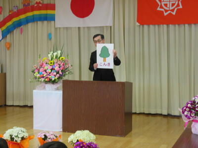 佐倉幼稚園の教育目標に合わせて、「元気の木」「本気の木」「根気の木」です。太い根がはって、すくすく育っていくように頑張ってほしいと思います。ちゅうりっぷ組のみんなの式に臨む態度は素晴らしかったです。