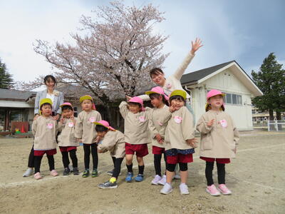 式が終わってから園庭に出て、佐倉をバックに今年度最初の集合写真を撮影しました。