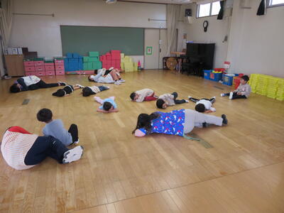 続けて、あいさつの仕方やいろいろな感情(楽しい 悲しい 怒った お腹すいた等々・・)を英語と楽しい動作で教えてくれました。みんなで楽しく動きました。