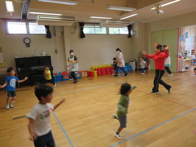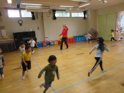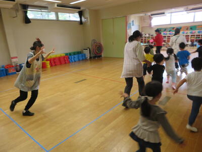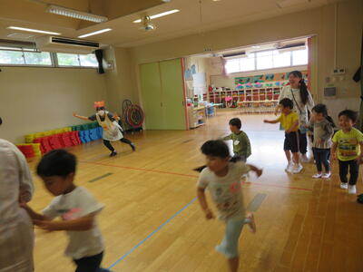 朝の時間、みんなで「オオカミさん!」遊びをしました。