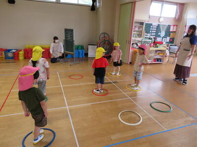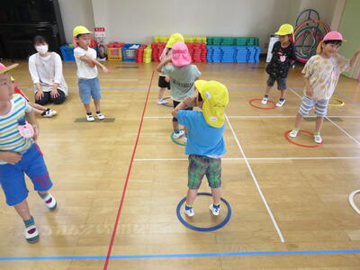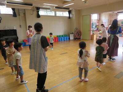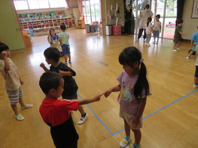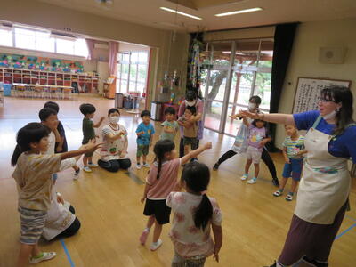 ステフィーと遊んだよ! 2023年7月3日 13時12分 今日はALT、ステフィーの来園日です。 一緒に夏祭りに向けての盆踊り練習をしたり、英語でジャンケンをしたり、ゲームをしたりして楽しい時間を過ごしました。