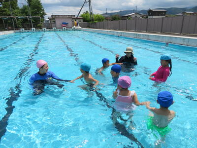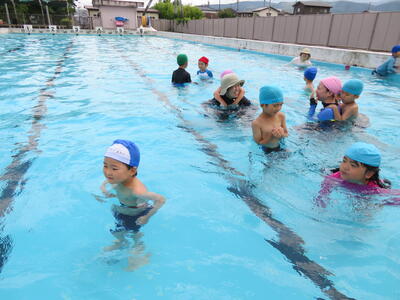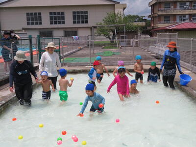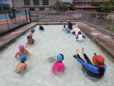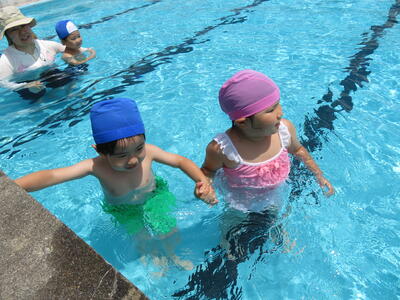 たんぽぽさんも水を怖がらずに大きなプールに入ることができました