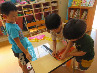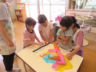 2023年7月6日 11時29分朝の会の後、みんなでくす玉につける飾りを作りました。