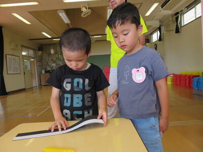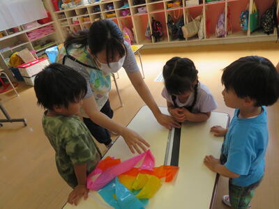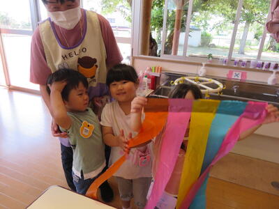 ちゅうりっぷさんは、たんぽぽさんに作り方をやさしく教えてくれました。ちゅうりっぷさんがやり方を説明してたんぽぽさんがテープを貼る作業でした。