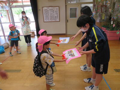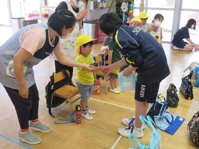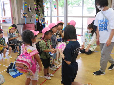最後にサプライズ。中学生からも園児たちに手作りのプレゼントをいただきました。