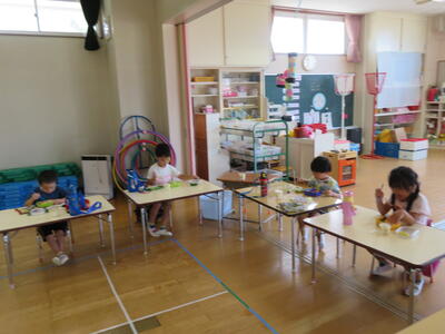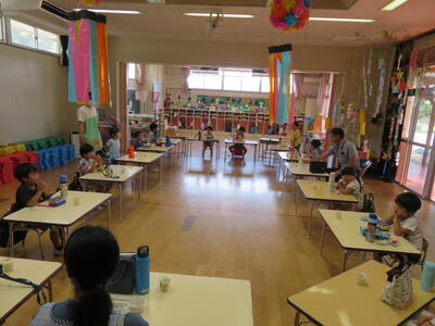 昼食時にちゅうりっぷさんが作ってくれたデザートをいただきました。今日は年少さん年長さん一緒の昼食でした。
