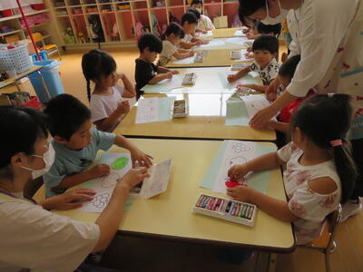 夏祭りにやるくじ引きのくじづくりをみんなでやりました。