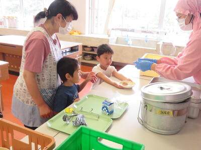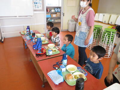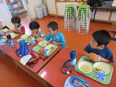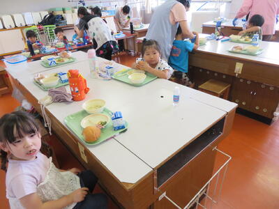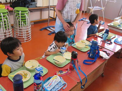 今回はたんぽぽ組のみんなも初めての給食です。