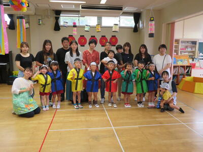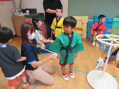 登園後、まずはお家の人に手伝ってもらってはっぴを着ました。