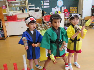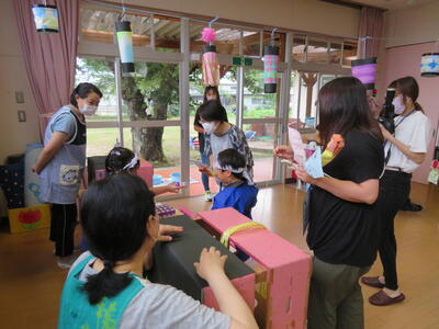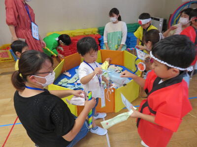 くじびきと輪投げと魚釣りのお店屋さんです。たんぽぽ組さんたちも頑張りました。