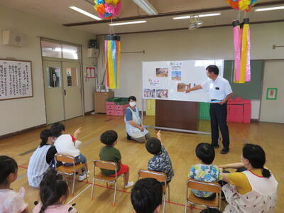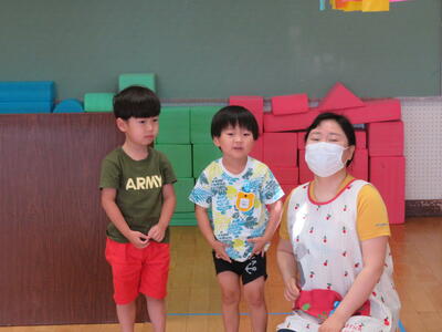 はじめに私から一学期の様子を写した写真を見ながら、園児たちの頑張りの様子を振り返りました。