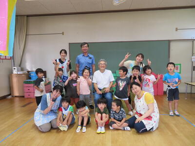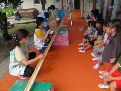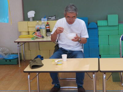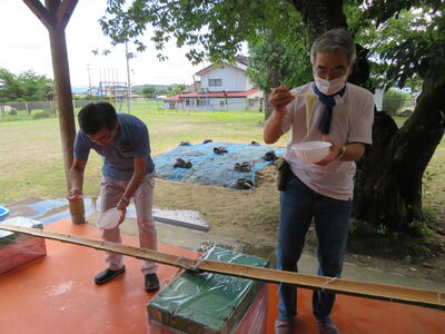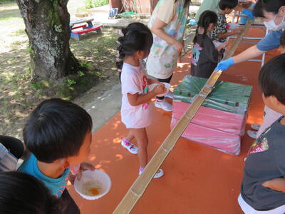 2023年7月20日 11時40分終業式が終わってから、テラスで流しそうめんをしました。