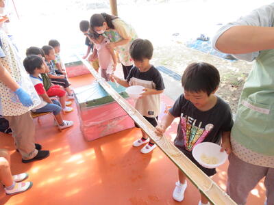 地域の方からいただいた竹を使って、本格的な流しそうめんです。