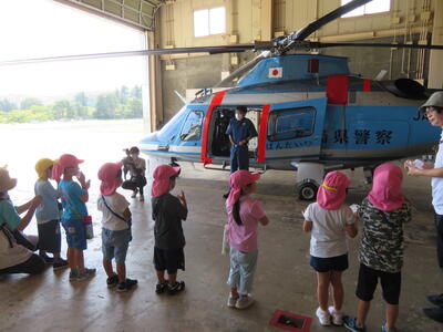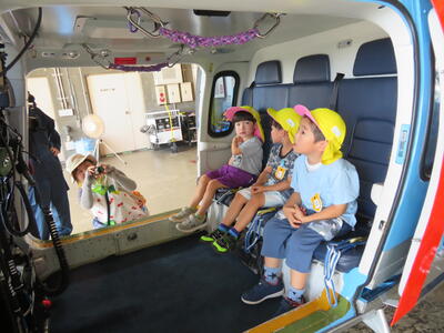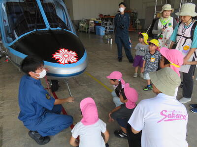 次は航空隊です。ヘリコプターがあってみんなびっくり。「よろしくお願いします。」