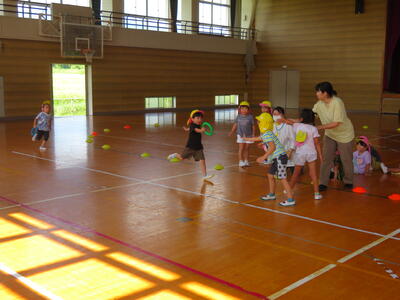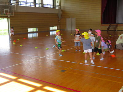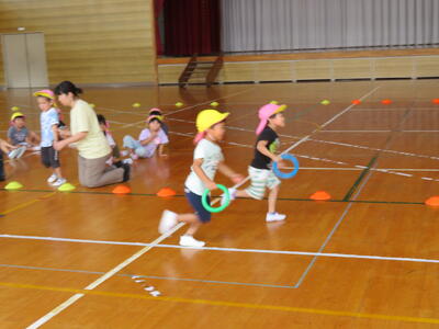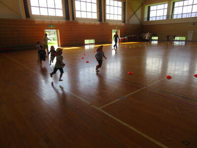第1回目なので、走る練習です。最初まっすぐ走りましたが、みんなとても上手だったので、リレーもやってみました。