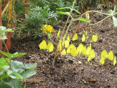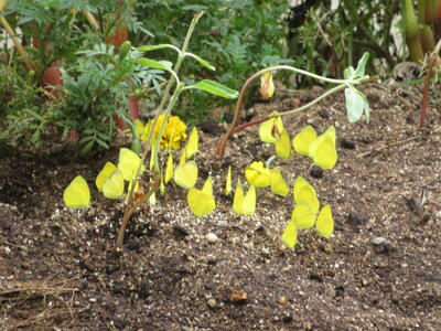 これって・・・? 2023年9月20日 12時33分 今朝、昨日新たにヒマワリを植えるために、牛糞を混ぜて耕した花壇に目をやると、何やら黄色い集団がヒラヒラと・・ なんとモンキチョウの集団でした。 なぜ?????? 水に集まっている? 牛糞に集まっている?