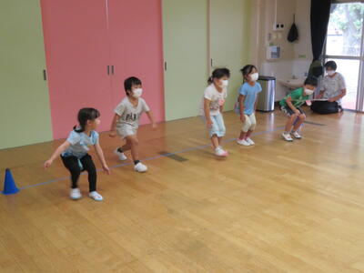 実習生が青旗をあげたら、前へ一歩ジャンプする。赤旗をあげたらその場に止まる。黄色と言ったらその場で左右を見る。というゲームです。