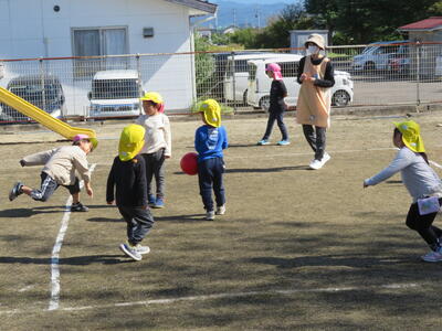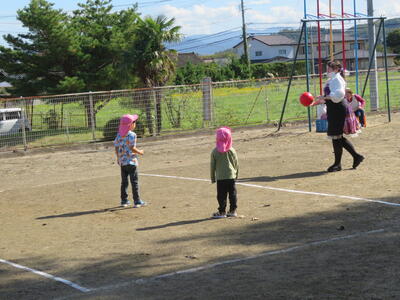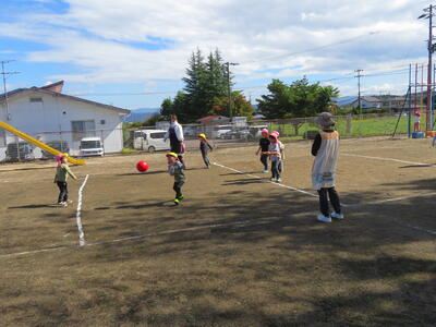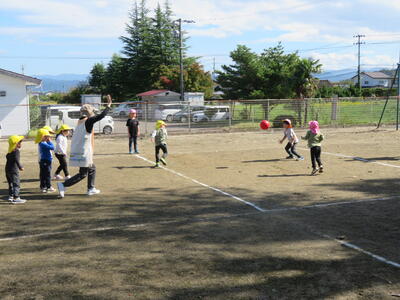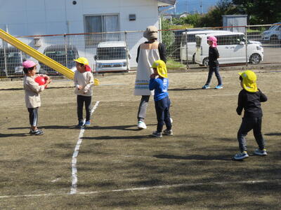 たんぽぽさんも一緒にドッジボール 2023年10月16日 10時58分 稲刈りの後は、天気が良いので外遊びです。 ちゅうりっぷさんが運動会でやったドッジボールを、今日はたんぽぽさんも一緒に楽しく遊びました。