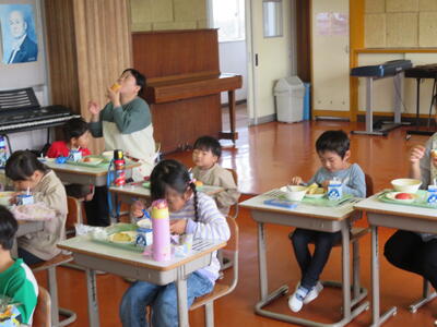 いつもは家庭科室で食べていましたが、今日は音楽室です。1年生になった気分で、一人一人別の机といすで食べました。