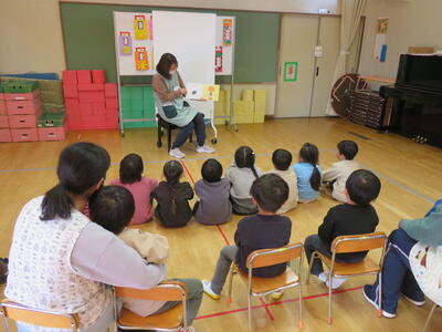 はじめに、七五三についてのお話や紙芝居を聞きました。どうして3歳 5歳 7歳でお祝いをするのか?大きくなるってどういうことなのか? 大きくなった皆さん 聞き方とっても上手でした。