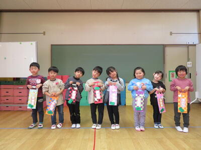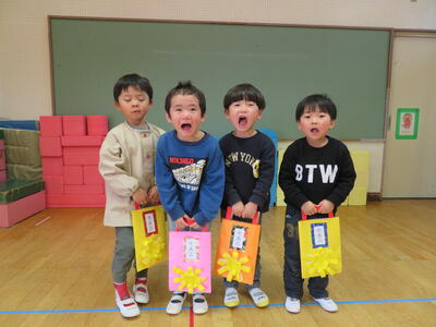 その袋に一人2本(紅白)の千歳あめを配りました。やっぱり大きくなった皆さんです。みんなしっかり「ありがとうございます。」と言えました。