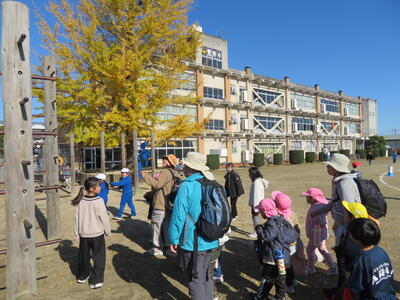荒井小学校へ到着。最初に校庭を1周しました。途中1年生や上学年の児童も声をかけてくれ、園児の移動について歩いてくれました。佐倉幼稚園卒園児にも会ってきました。