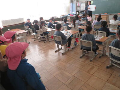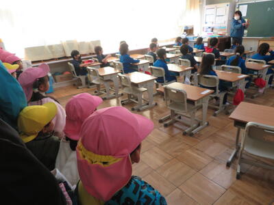 1年生2年生のみんなしっかりお話を聞いている姿に、憧れのまなざしの園児たちでした。