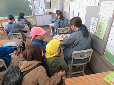6年教室では、園児のお姉さんに会ってきました。粘土で図画工作の授業でした。