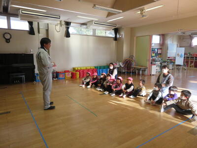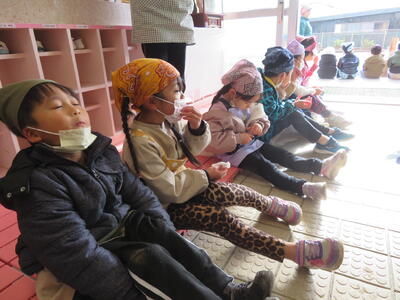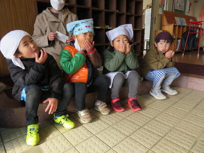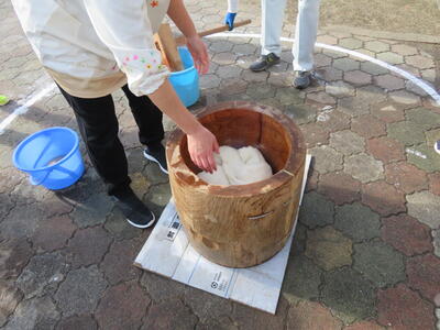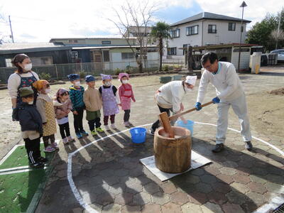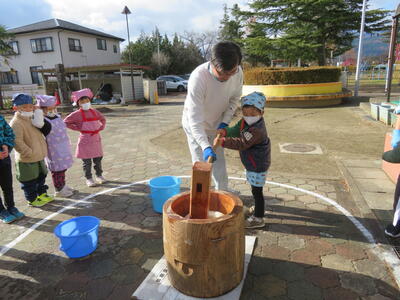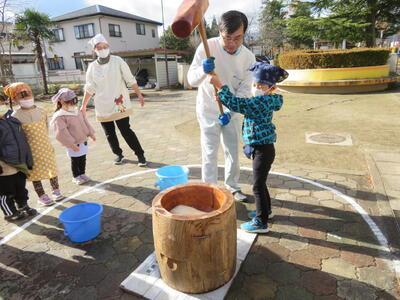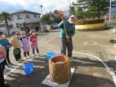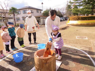 最初はつく様子を見ていましたが、続けて、全員杵を持って餅つきを体験しました。みんな上手にできました。