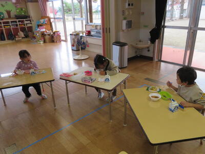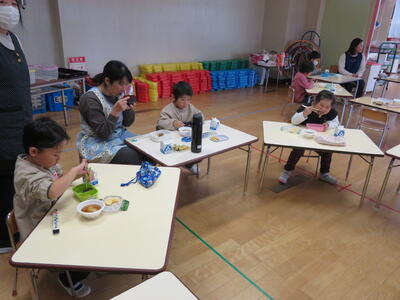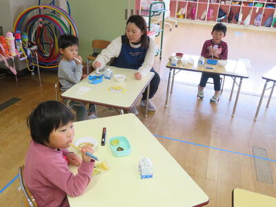 遊戯室へ移動し、今度は会食です。みんなで輪になって食べました。おかわりをする子も続出です。