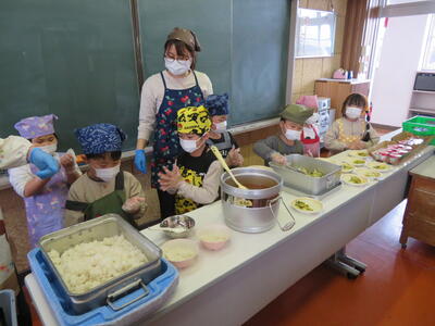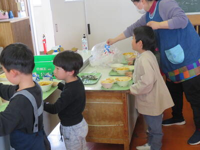 配膳開始 初めてとは思えないくらいに上手にできました。これなら1年生になっても大丈夫!