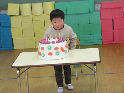 3月生まれはたんぽぽさんから一人です。5本のロウソクの火を一気に消しました。