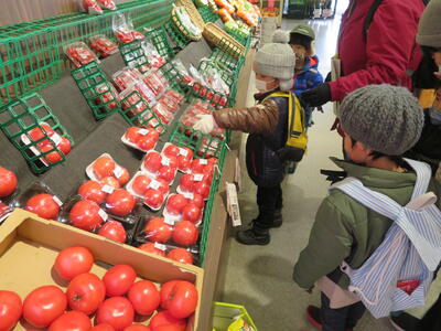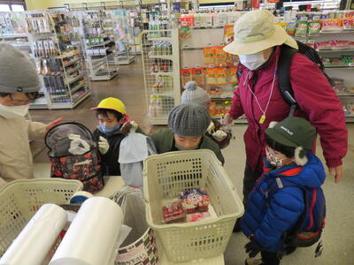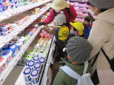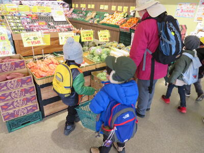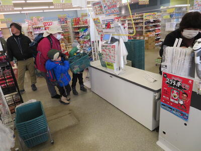 スーパーマーケットではお目当ての品をみんなで探し、かごに入れました。(何を買ったかはお子さんに聞いてみてください)