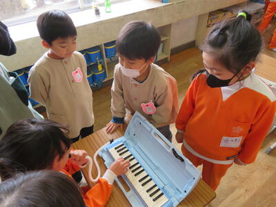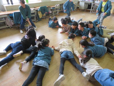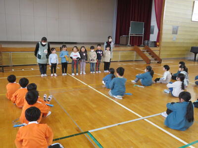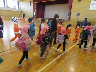 2024年3月11日 10時13分給食が食べ終わり、園児たちは1・2年生教室に向かいました。
