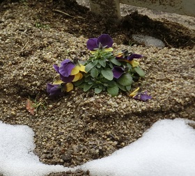 さて,寒い日が続き今日また積雪となりましたが,校舎の目の前の花壇には,下の写真のようにパンジーが植えられています。先週末は雪が解けて,その姿を見ることができました。調べてみると,パンジーの花言葉は,色によって違うようです。紫のパンジーの花言葉は,「思慮深い」「誠実」「忠実」「律儀」。黄色のパンジーの花言葉は「つつましい幸せ」「田園の喜び」。他の色にもそれぞれ花言葉がありました。でも,どれもキューピッドの矢がパンジーを生んだという物語と結びついているようですから,この花を見て心を動かされるのは,当然なのかもしれません。まだまだ冬は続きますが,またこのパンジーが姿を現すことを心待ちにしています。