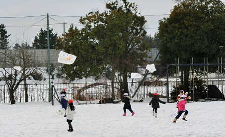 2017年1月27日 12時00分 3校時目に1年生が「凧揚げ」をしていました。ビニールに思い思いの柄を描いた凧を揚げて活動していました。昔はよく見かけた光景ですが,今は揚げる場所が制限されたり,外遊びをする子が少なくなったりして,見かけなくなりました。
