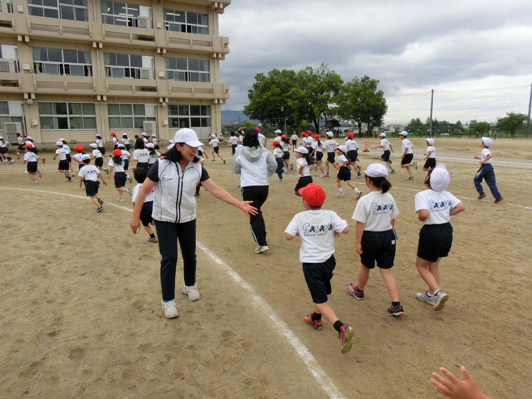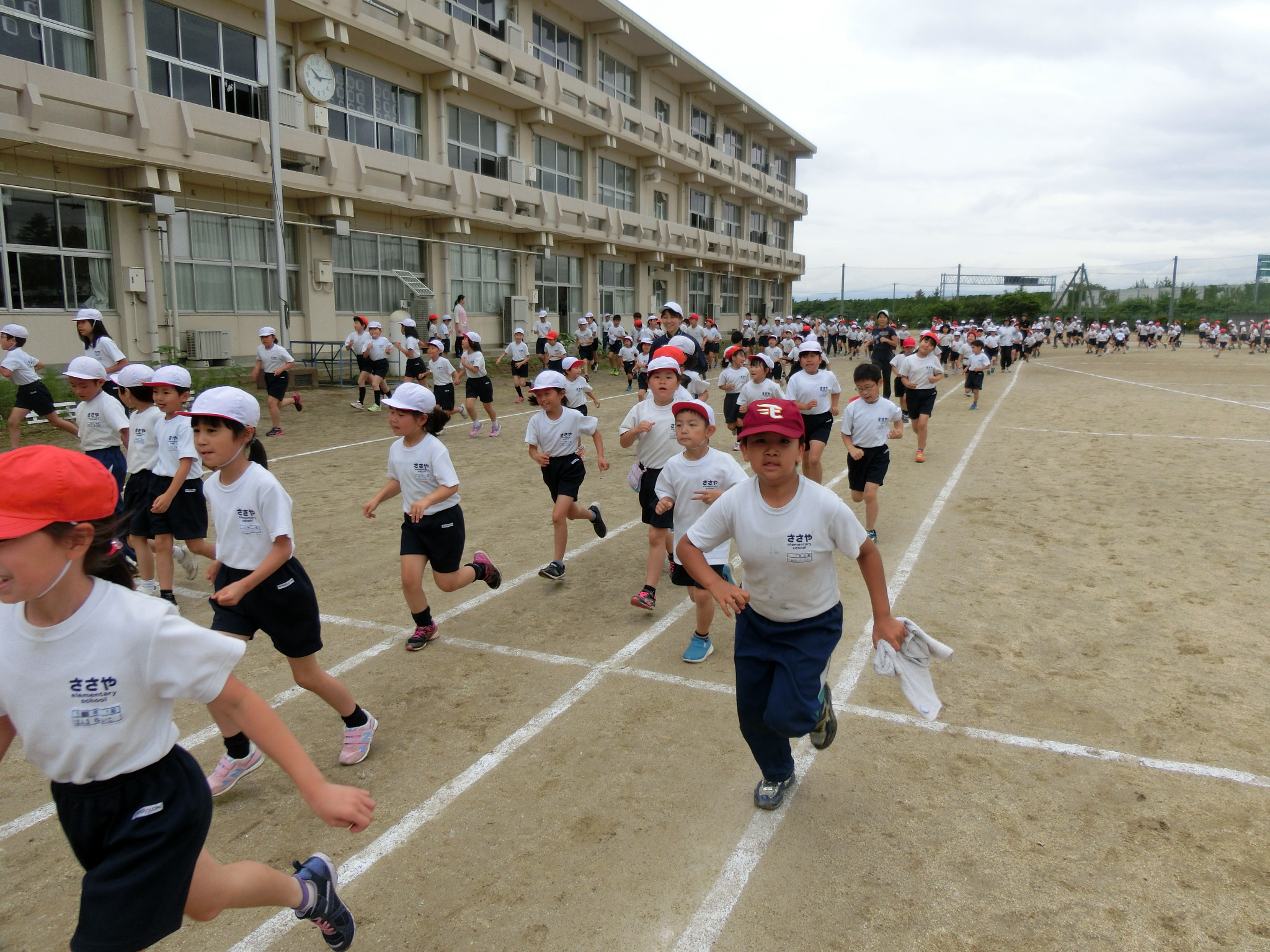 わせて校庭を走ります。大人数ですので、トラック外側は