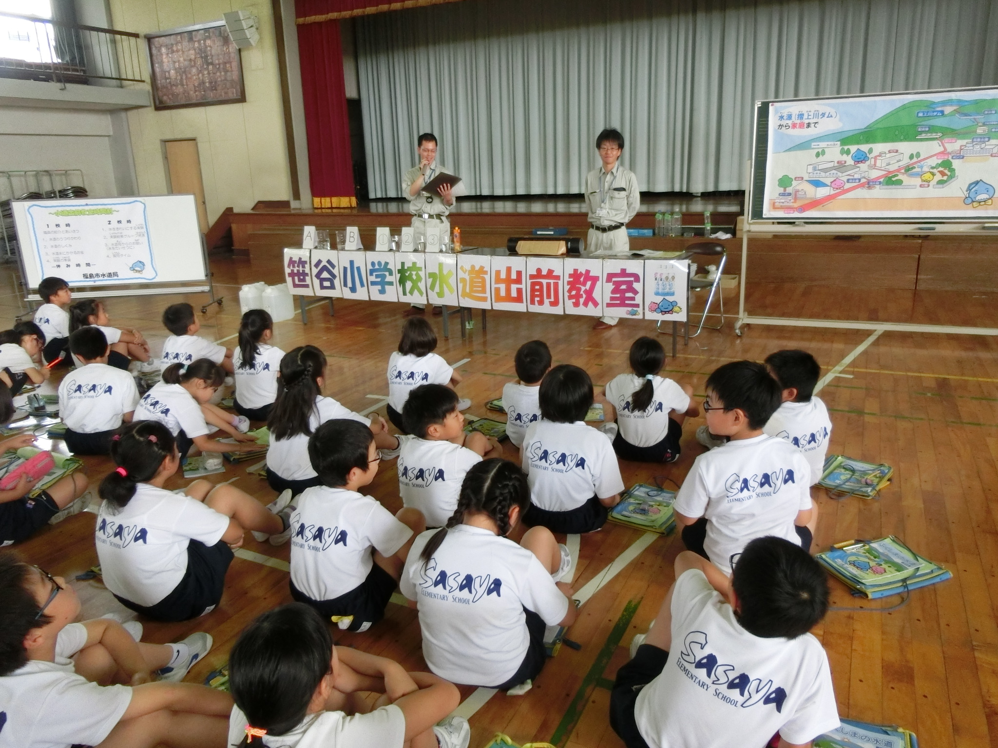 7月4日(水)4年生を対象に福島市水道局職員による「水道出前教室」が行われました。福島市の学校や家庭に供給される水道の水源が摺上川ダムであることやダムの水をきれいにするところが浄水場であることについて詳しく説明を受けた子どもたち。そのあとはペットボトルで作ったろ過装置を使って、きれいな水を作る実験に挑戦。浄水場のろ過池の仕組みについて理解を深めることができました。
