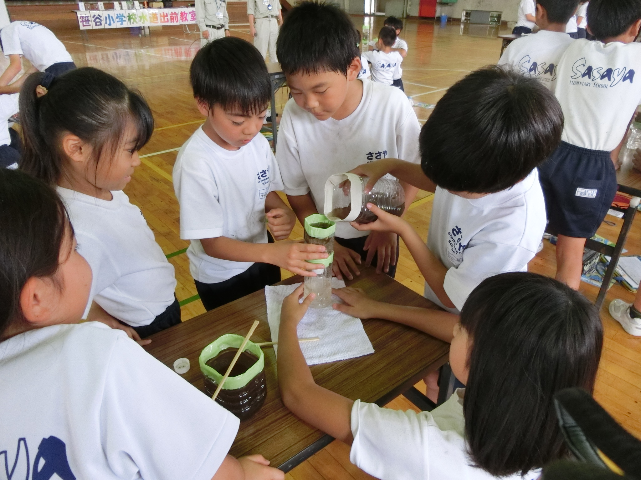 2018年7月10日 09時29分7月4日(水)4年生を対象に福島市水道局職員による「水道出前教室」が行われました。福島市の学校や家庭に供給される水道の水源が摺上川ダムであることやダムの水をきれいにするところが浄水場であることについて詳しく説明を受けた子どもたち。そのあとはペットボトルで作ったろ過装置を使って、きれいな水を作る実験に挑戦。浄水場のろ過池の仕組みについて理解を深めることができました。