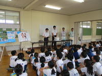 始めに,小室さんから「クールチョイス=賢い選択」の説明をしていただき,地球温暖化を防止するために,こまめに電気を消したり,3R(リユース・リデュース・リサイクル)を心がけて生活したりすることの大切さを教えていただきました。