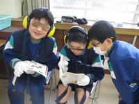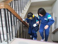 そして、いよいよ「疑似体験」です。体に重りをつけて筋力が衰えた状態はどういう様子なのかを感じたり、ヘッドホンをつけて話を聞いたり・・・。特に、装具を身につけて、背中が曲がった状態を維持したまま階段を上り下りするのは大変な重労働でした。「うわあ、脚が上がらないよお」「身体のバランスが取りにくい」「まっすぐに歩こうと思っているんだけど難しい」という声があちらこちらから聞こえてきます。子どもたち全員がそろりそろりと慎重に昇り降りしていました。装具を脱いだ後はだいぶすっきりした様子。大きく背伸びをした後で、「でも、お年寄りは装具を脱げないんだよなあ……。」「大変だよなあ……。」と、しみじみその苦労を感じ、感想を交流する姿が見られました。