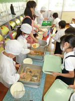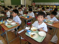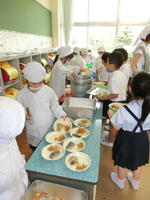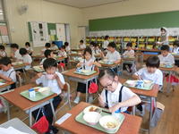 2020年6月3日 13時31分給食開始3日目を迎えました。初日のコッペパン、2日目のソフト麺に続き、今日はご飯!1年生の給食当番さんにとって、3日目の今日は袋に入った主食を配る作業とは違って、しゃもじを使ってご飯をお椀に取り分けるという難易度アップの試練の日・・・と思いきや、担任の先生の支援を受けながら、1年生給食当番みんな、一生懸命にがんばりました!当番さんからお汁やご飯を受け取る子ども達も実に行儀よく上手に自分の席に運ぶことができました。