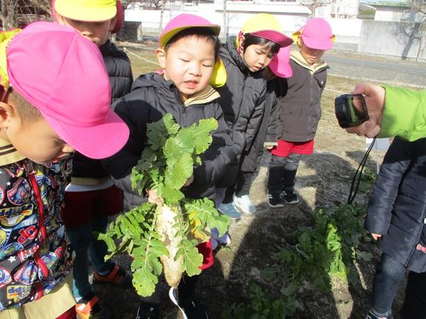 はじめに、園畑のかがやきファームに出かけダイコン掘りをしました。あしたひきな炒りにして食べます。