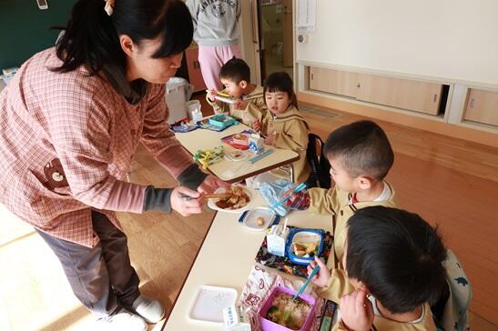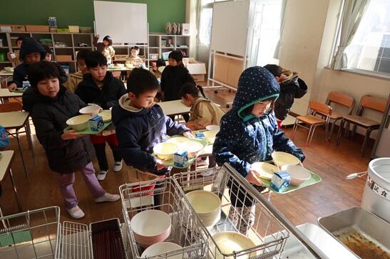 給食の配膳の様子です。出来るだけ小学校に近づけるように実施しています。