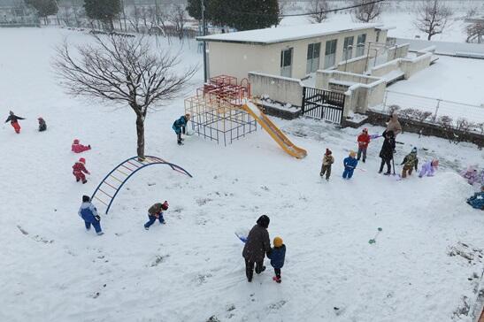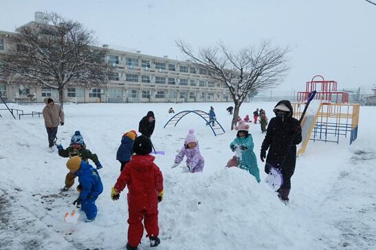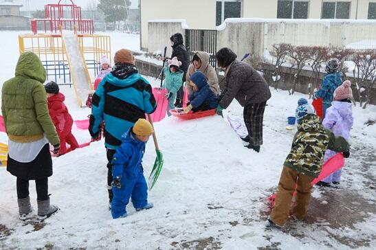 最初は、在園児と一緒に園庭で雪遊びです。雪の滑り台も作って滑りました。