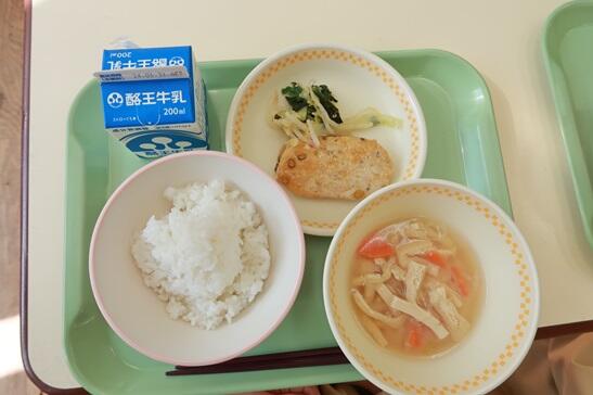 今回のメニューは、福島ぐるっとつくね、和風サラダ、しみ豆腐の味噌汁とご飯と牛乳です。